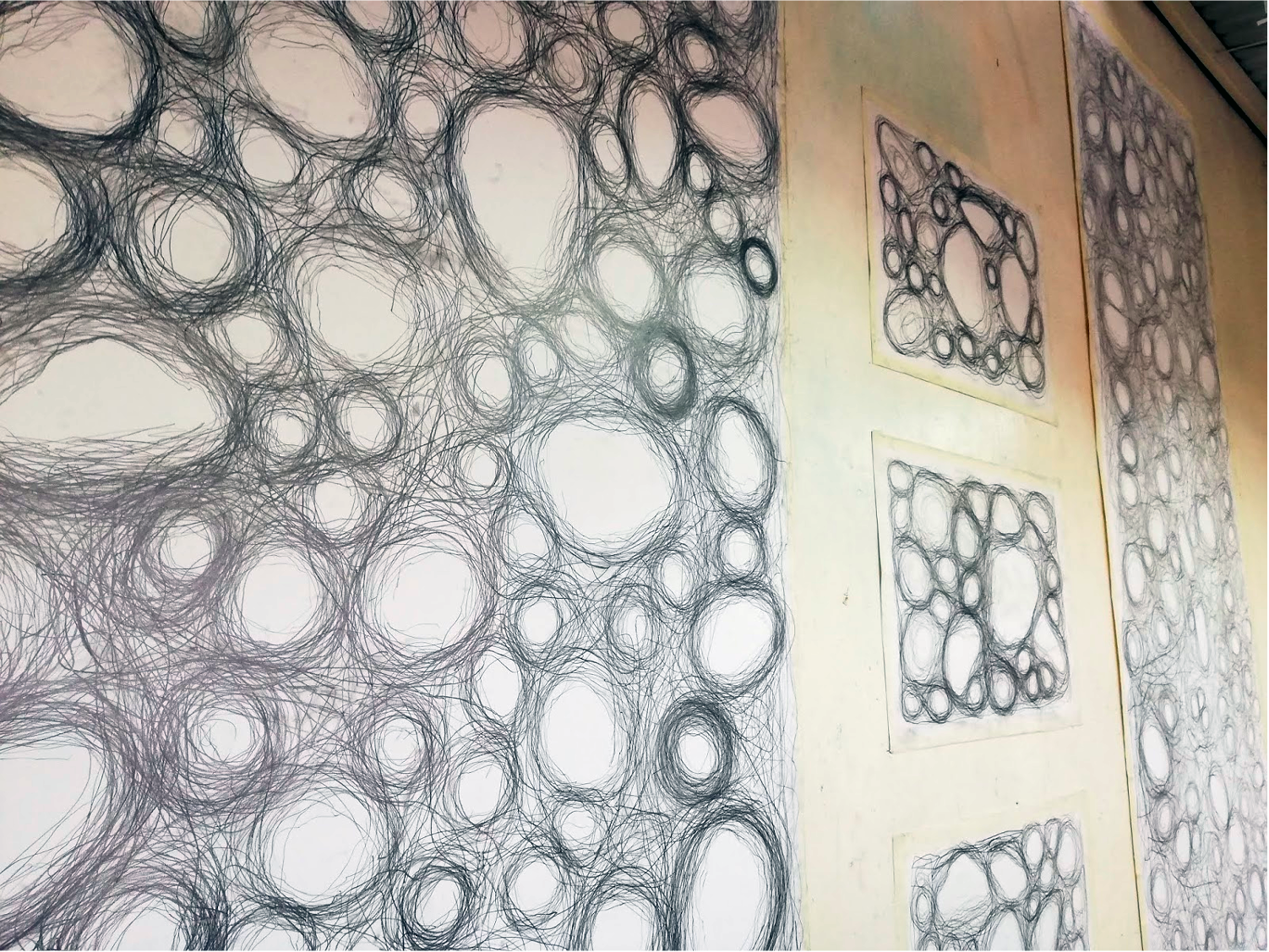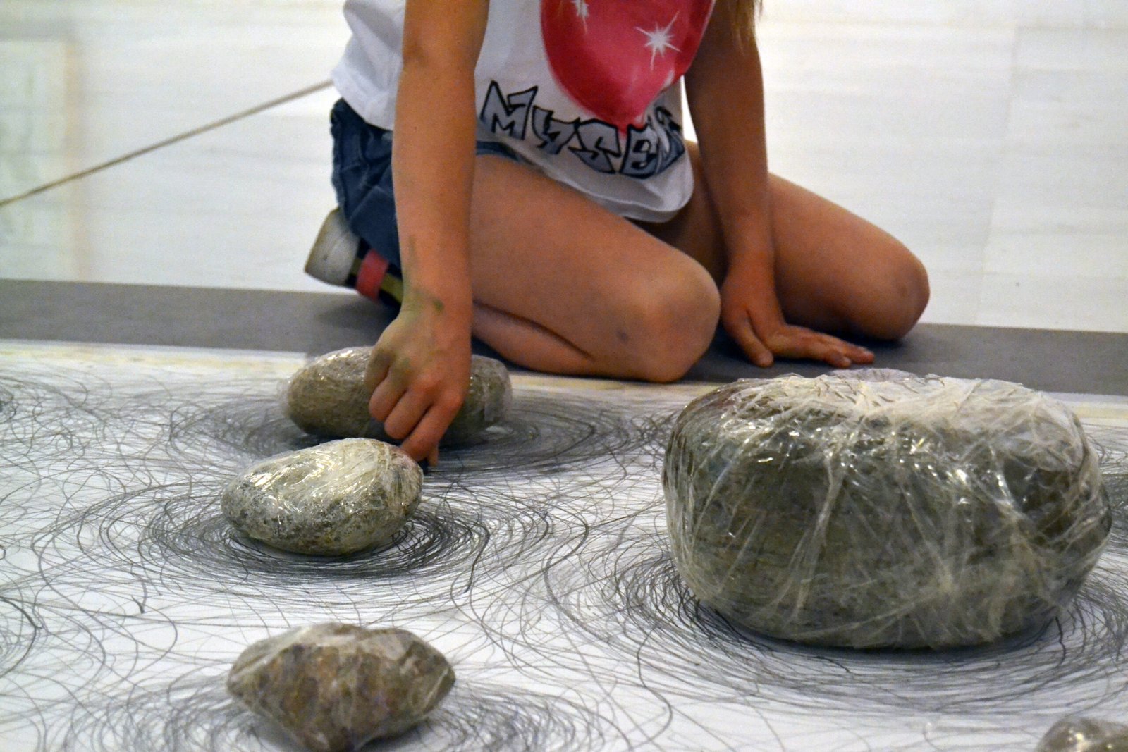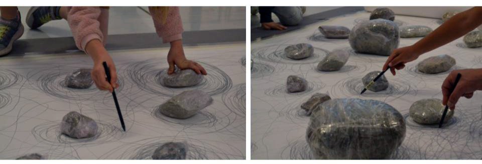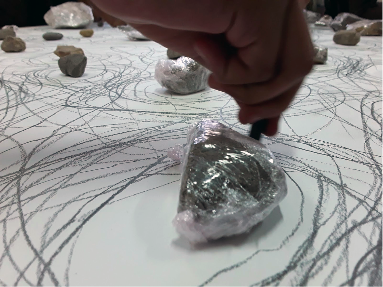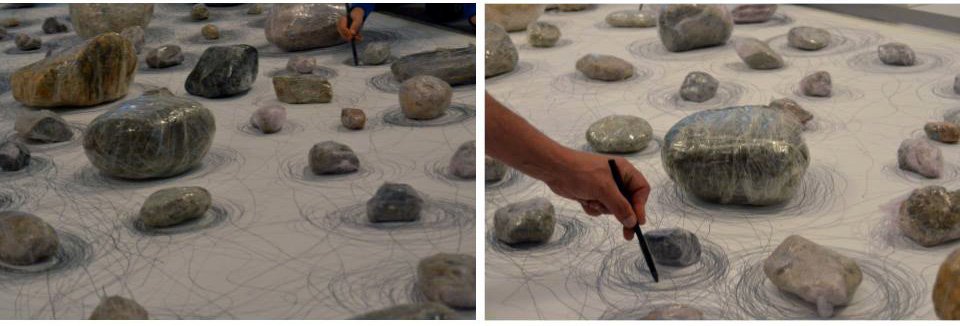 Esta intervención a/r/tográfica propone un ejercicio de dibujo que exige al participante un seguimiento minucioso de formas naturales —piedras envueltas en film transparente y dispuestas sobre un papel de grandes dimensiones extendido en el suelo—. Es necesario que se vaya ganando un control preciso del trazo, reforzando la seguridad del gesto y estimulando a realizar largas líneas continuas. Las líneas, en este caso, son los únicos elementos constitutivos del dibujo. El color queda restringido al del grafito. Ritmo y trazo deben generarse de forma lenta y cuidadosa, sin levantar la punta del lápiz del papel, de modo que se produzcan pequeñas desviaciones y se evite la repetición sobre trazos ya realizados.