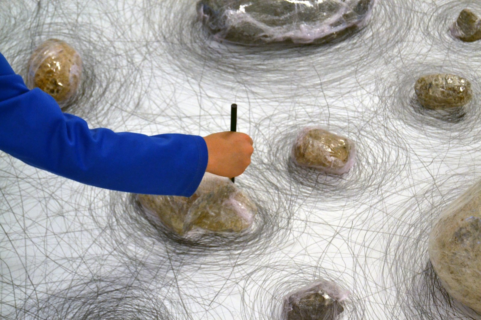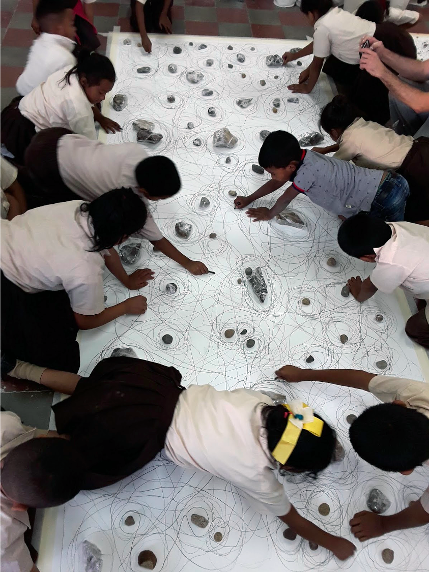Tipología: Dibujo monumental colaborativo realizado con líneas continuas dibujadas alrededor de piedras.