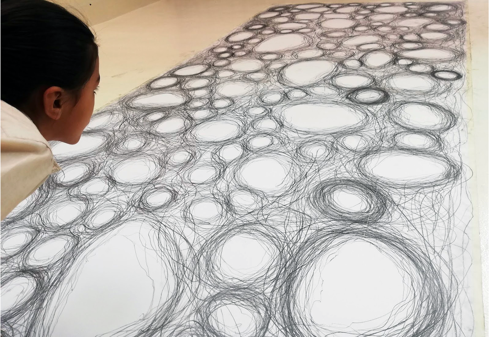 1. Cambia tu concepto de qué es dibujar: Dibujar con una implicación corporal completa, -a tan gran tamaño-, utilizando todo el cuerpo para trazar las líneas y desplazarse por el espacio de trabajo.