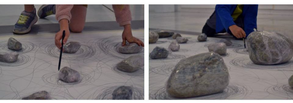 La actitud física de los niños sobre el dibujo de gran formato les lleva, en ocasiones, a apoyarse directamente sobre el papel, rodear el cuerpo de sus compañeros o desplazarse de una piedra a otra —a veces más grande, a veces más pequeña— para acceder a distintas zonas del dibujo.