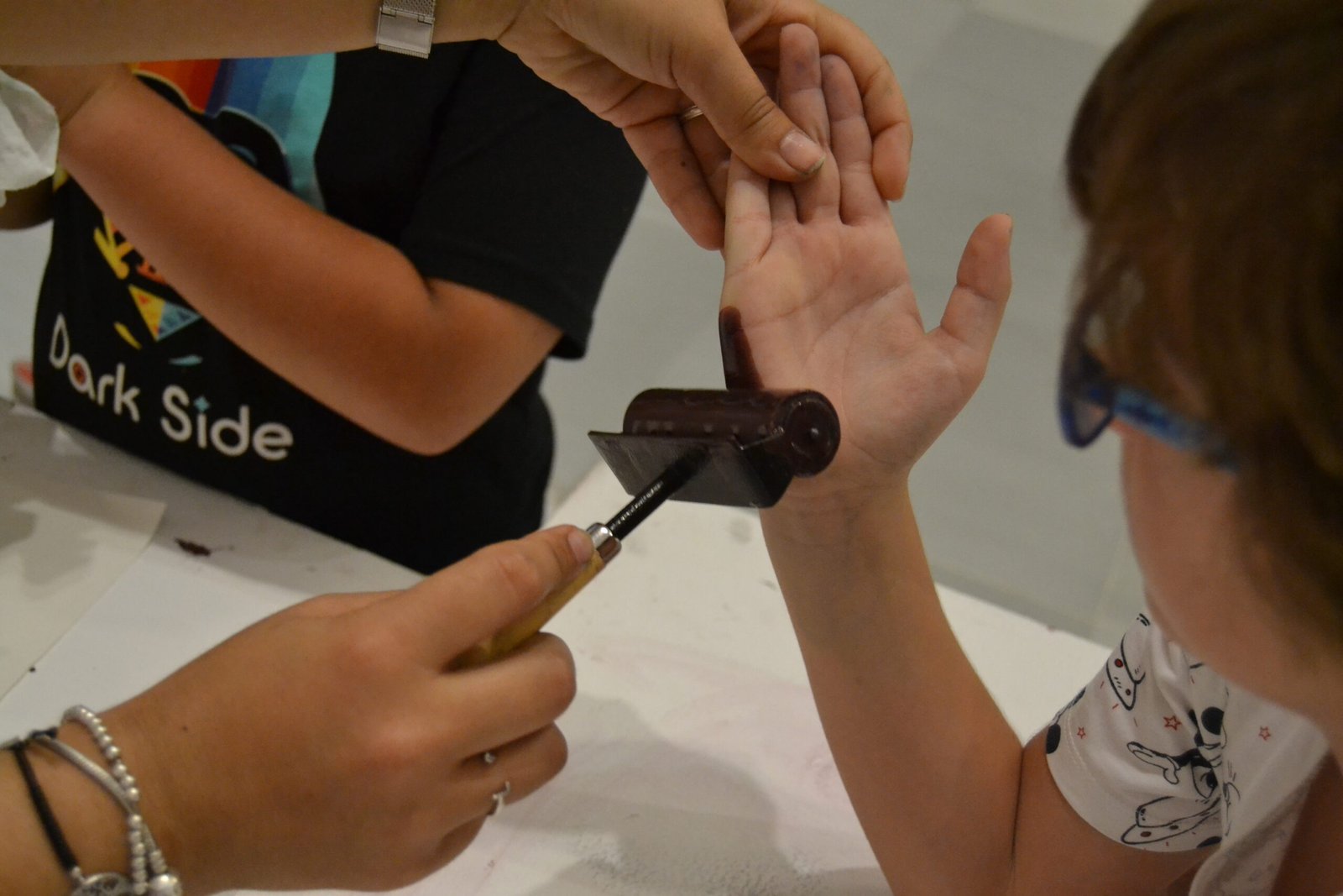 • Pedir que cierren el puño y estampen varias veces con la misma zona del puño sobre el papel, girándolo ligeramente en cada impronta.