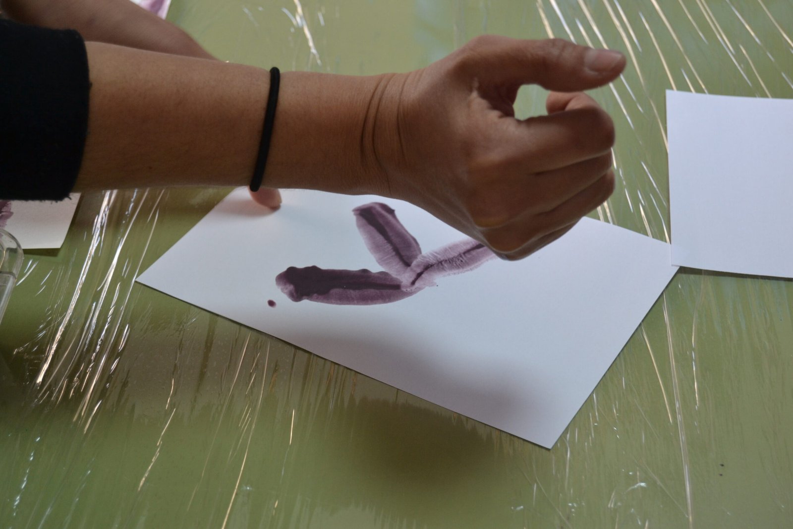 Es una estrategia de creación en dos fases. En la primera, cada participante cierra su mano en forma de puño. Empapa la parte inferior del puño en pintura acrílica de color violeta e imprime su huella tres o cuatro veces sobre un papel de 21 × 14,5 cm. Conviene girar ligeramente el puño para generar formas diferentes y simular los pétalos de una flor. Luego se deja secar el papel hasta el día siguiente.