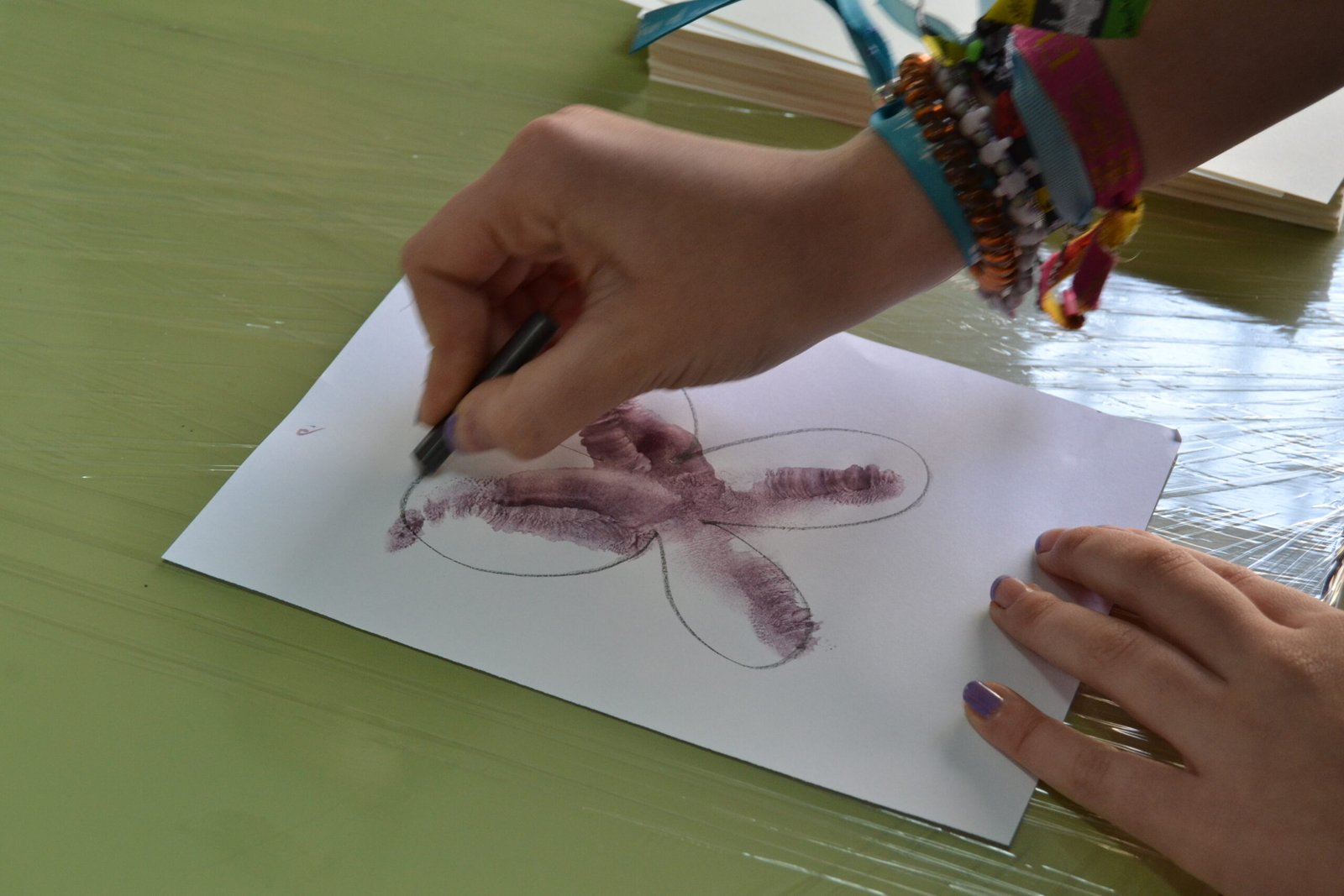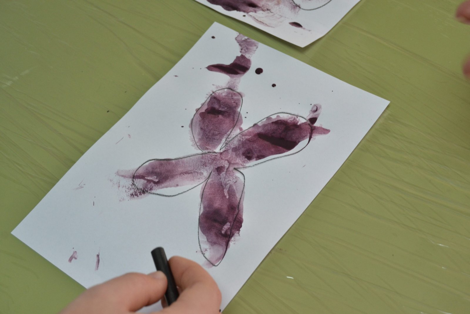 La segunda fase es elegir uno de los papeles previamente pintados por una persona y dibujar con lápiz cuatro pétalos. Los trazos deben rodear las manchas ya secas y reforzar la forma de la flor. Se pueden añadir detalles en la flor.